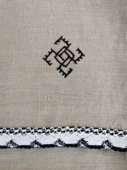 Lina dvielis lielais 95x150 melni balta mežģīne izšuvums PĒRKONKRUSTS