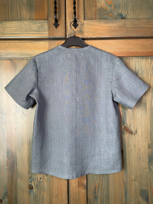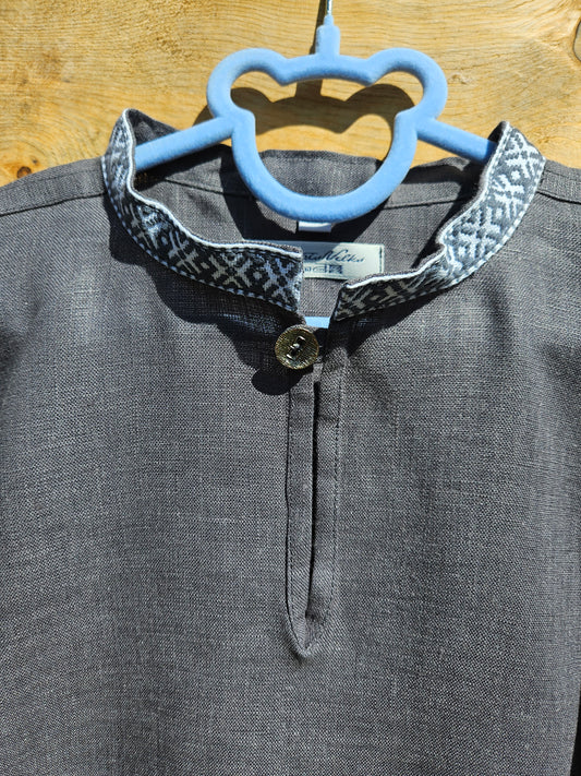 Zēnu lina krekls tumši pelēks ar raksatinu krāgu 140 izm