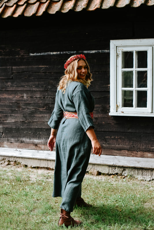 Sieviešu kleita lina tumši zaļa 42 izm ar rakstainu jostu