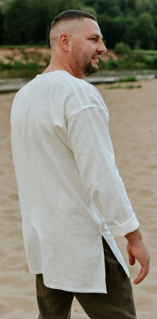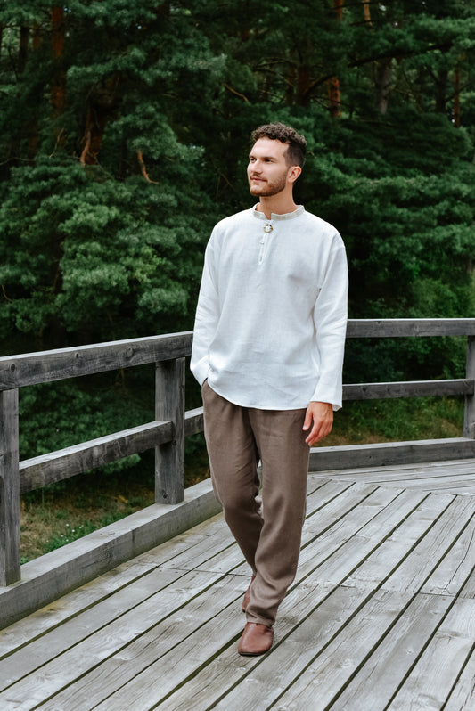 Vīriešu krekls lina balts ar rakstainu krādziņu S-M-L-XL-2XL-3XL