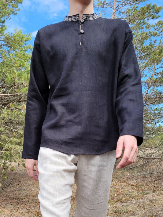 Vīriešu krekls lina melns ar rakstainu stāvkrāgu M-L-XL