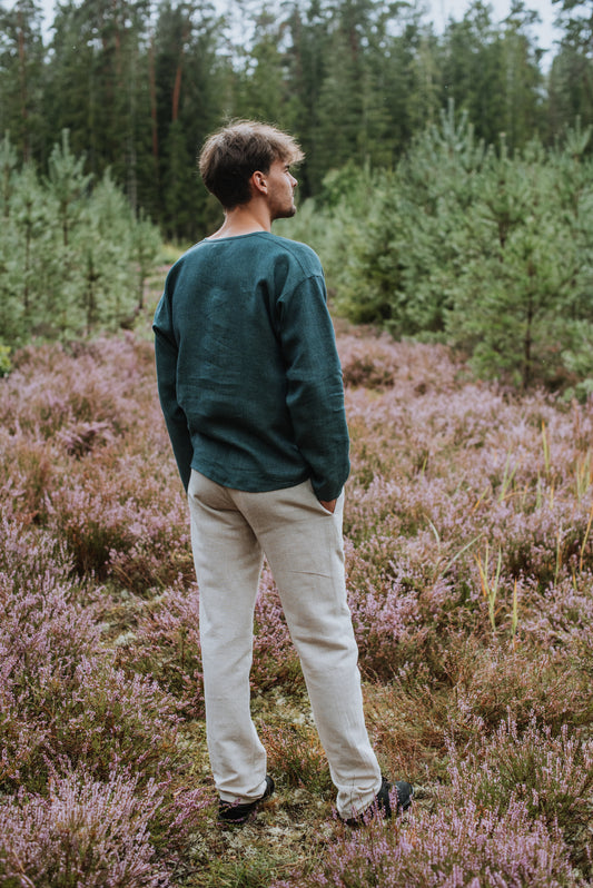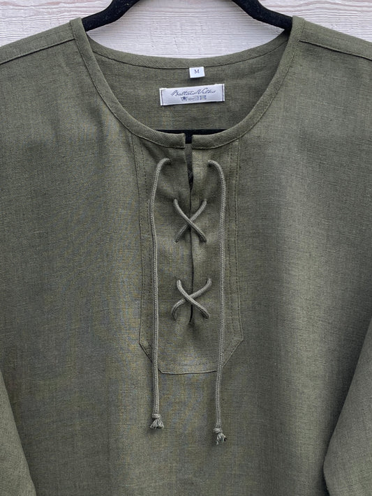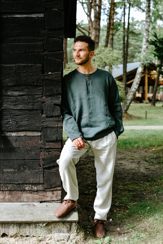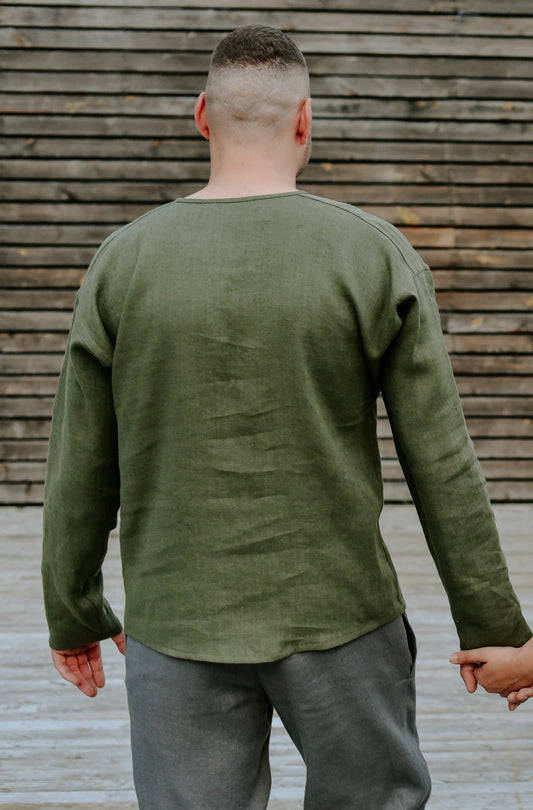 Vīriešu krekls lina sūnu zaļš ar lina auklu M-L