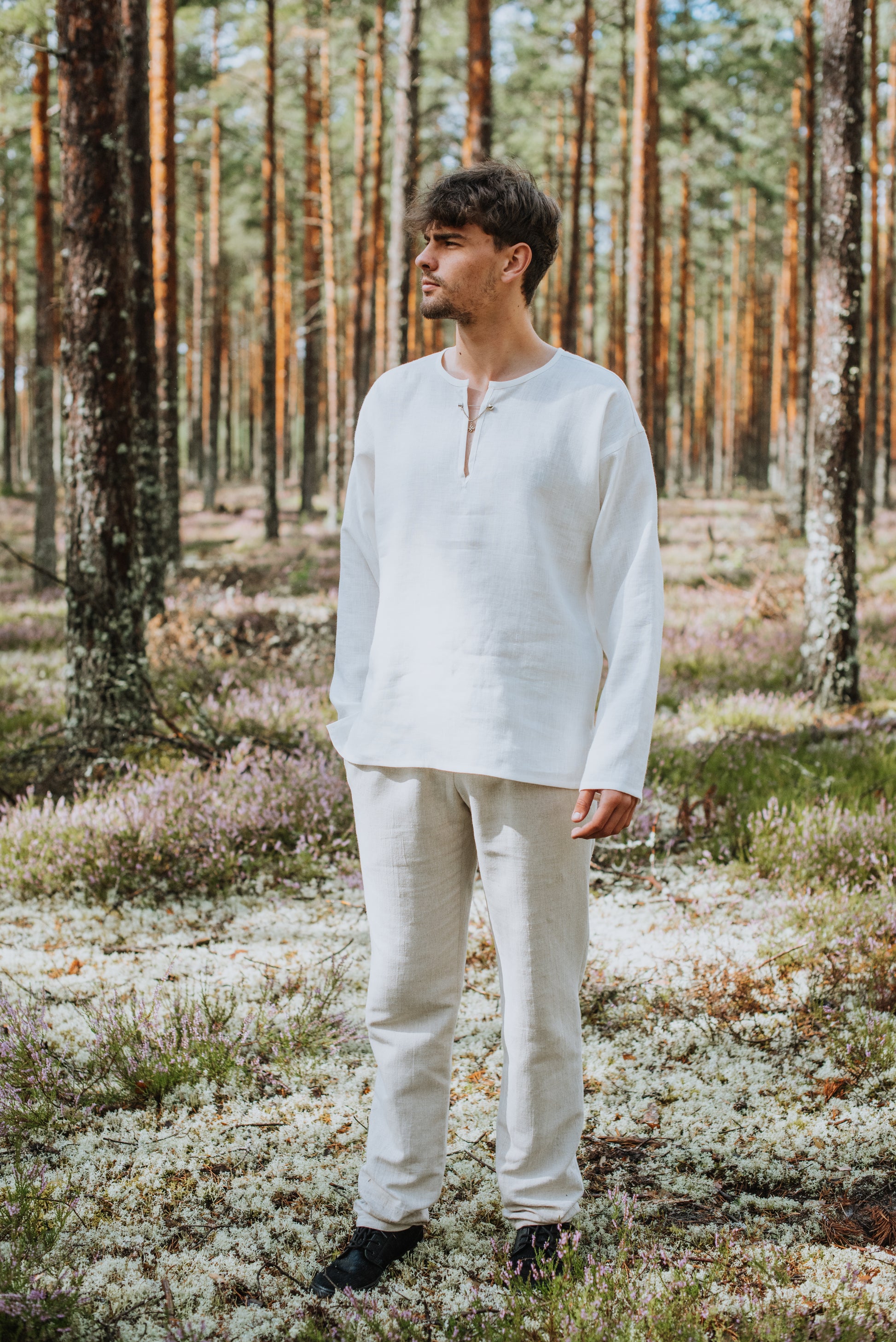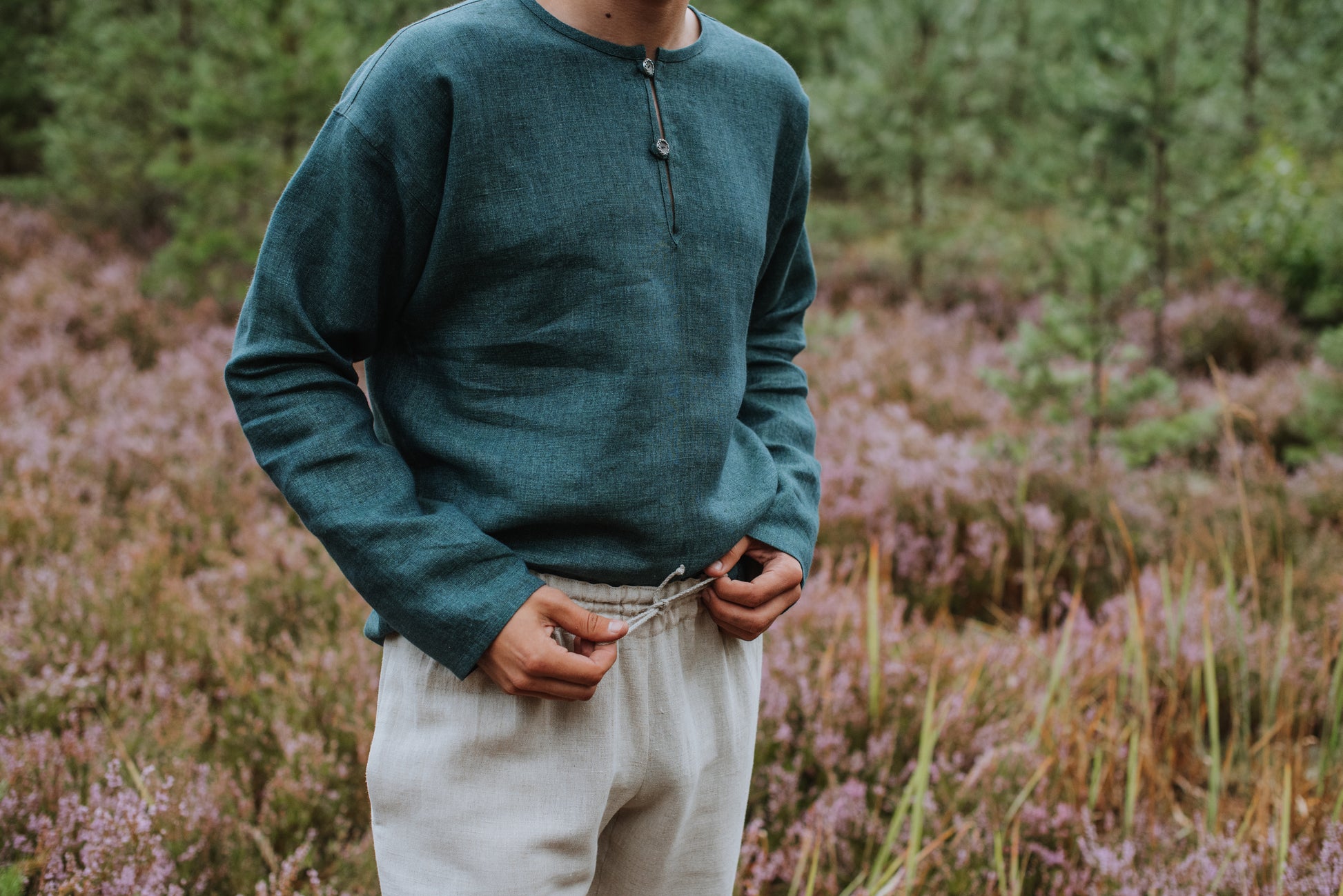 Vīriešu bikses - taisna piegriezuma, brīvi krītošas, sānos kabatas.