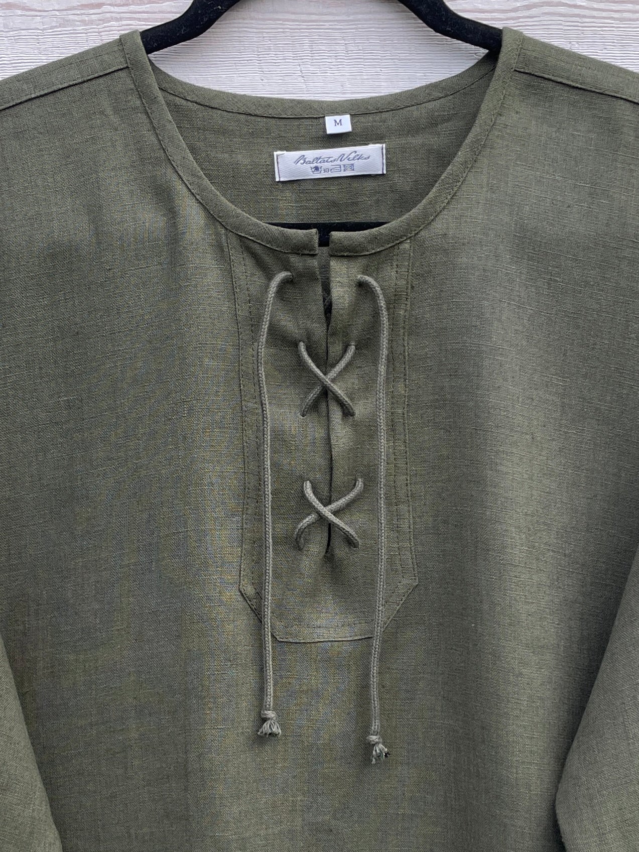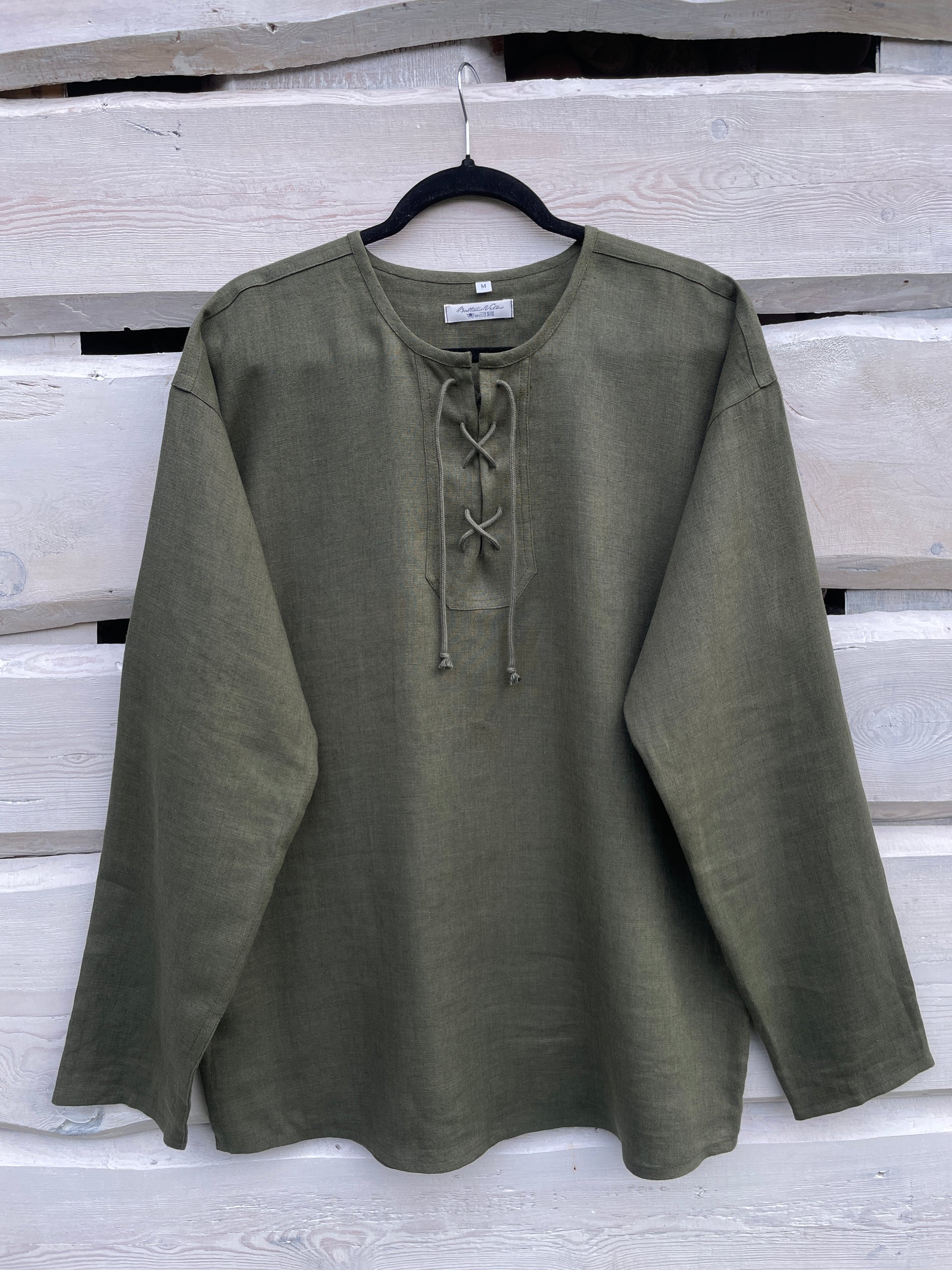Vīriešu krekls lina sūnu zaļš ar lina auklu M-L