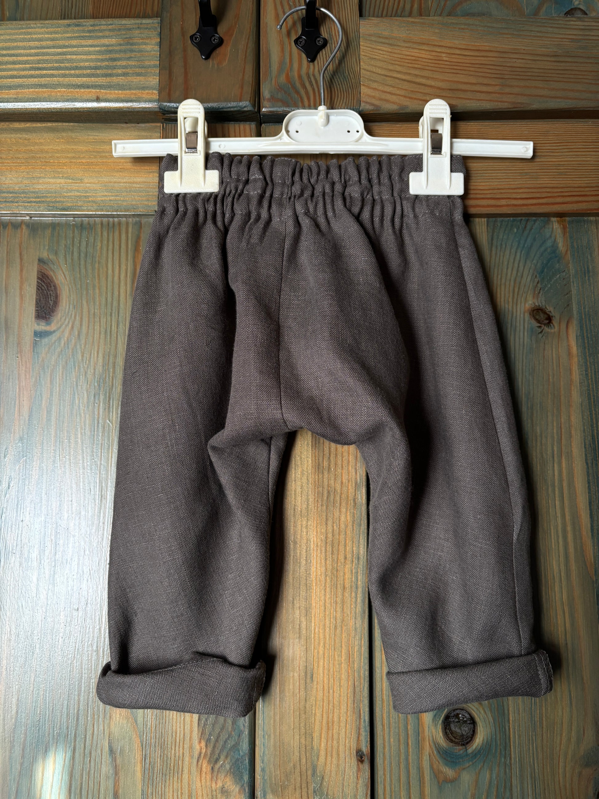 Zēnu lina bikses tumši brūngani pelēkas harēmtipa 68 izm