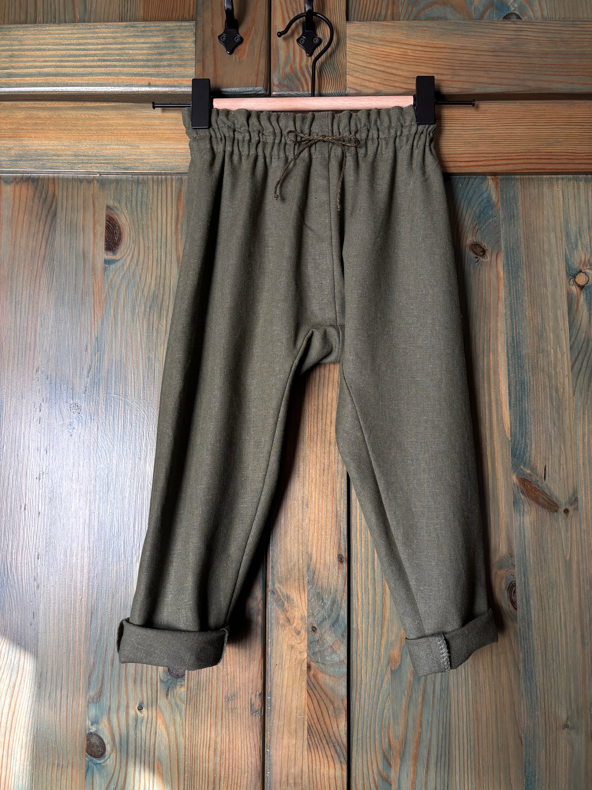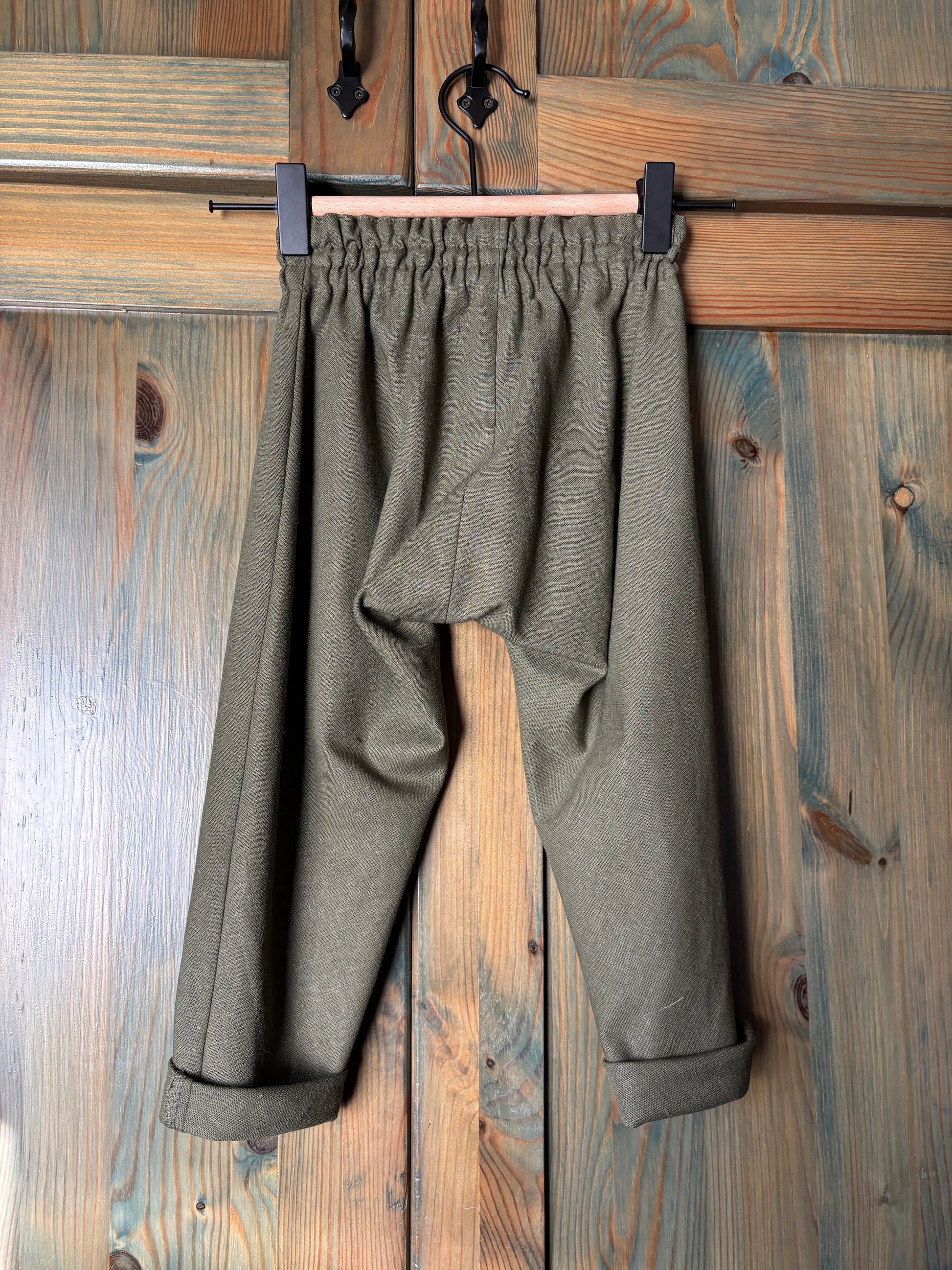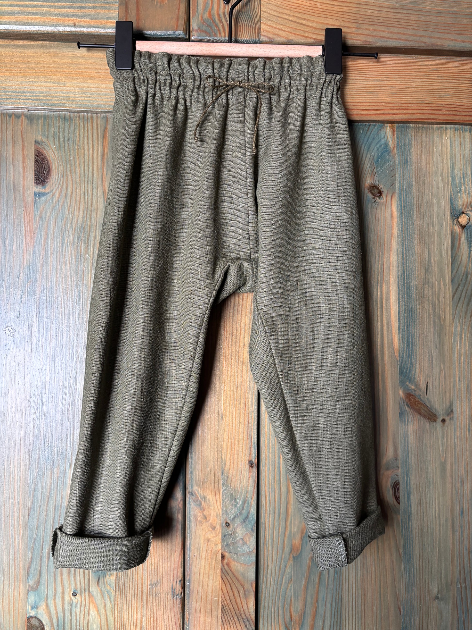 Zēnu lina bikses tumši olīvzaļas harēmtipa 92-98 izm
