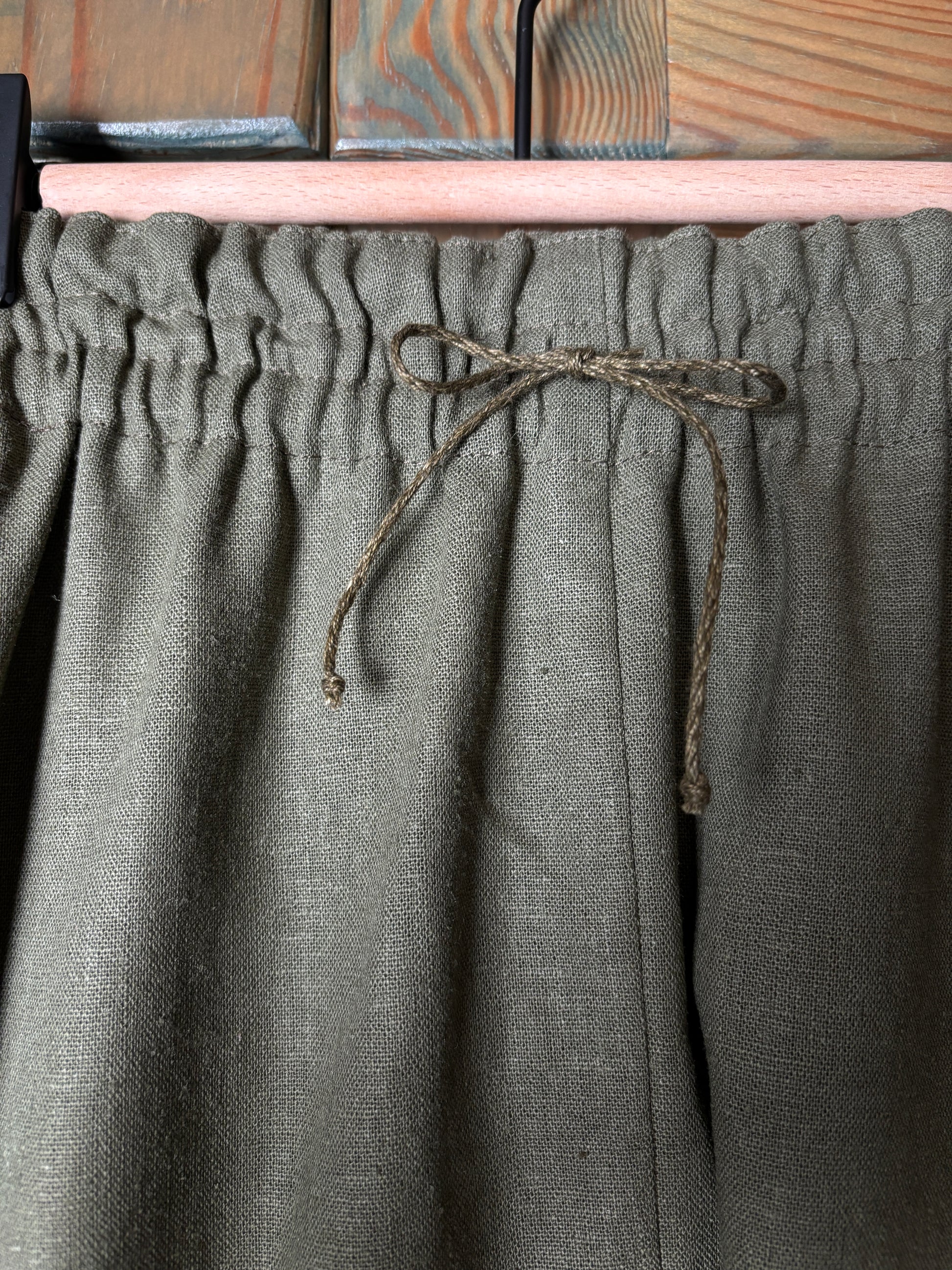 Lina bikses tumši olīvzaļas, harēmtipa piegriezums, brīvi krītošas, atloks bikšu galos.