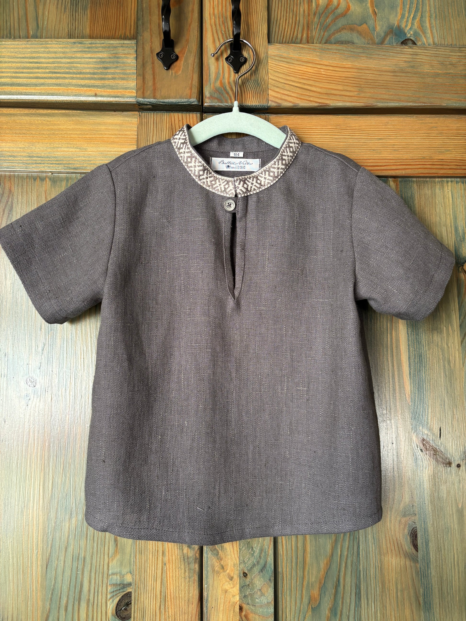 Lina krekls tumši pelēks ar rakstainu lenti stāvkrādziņam.