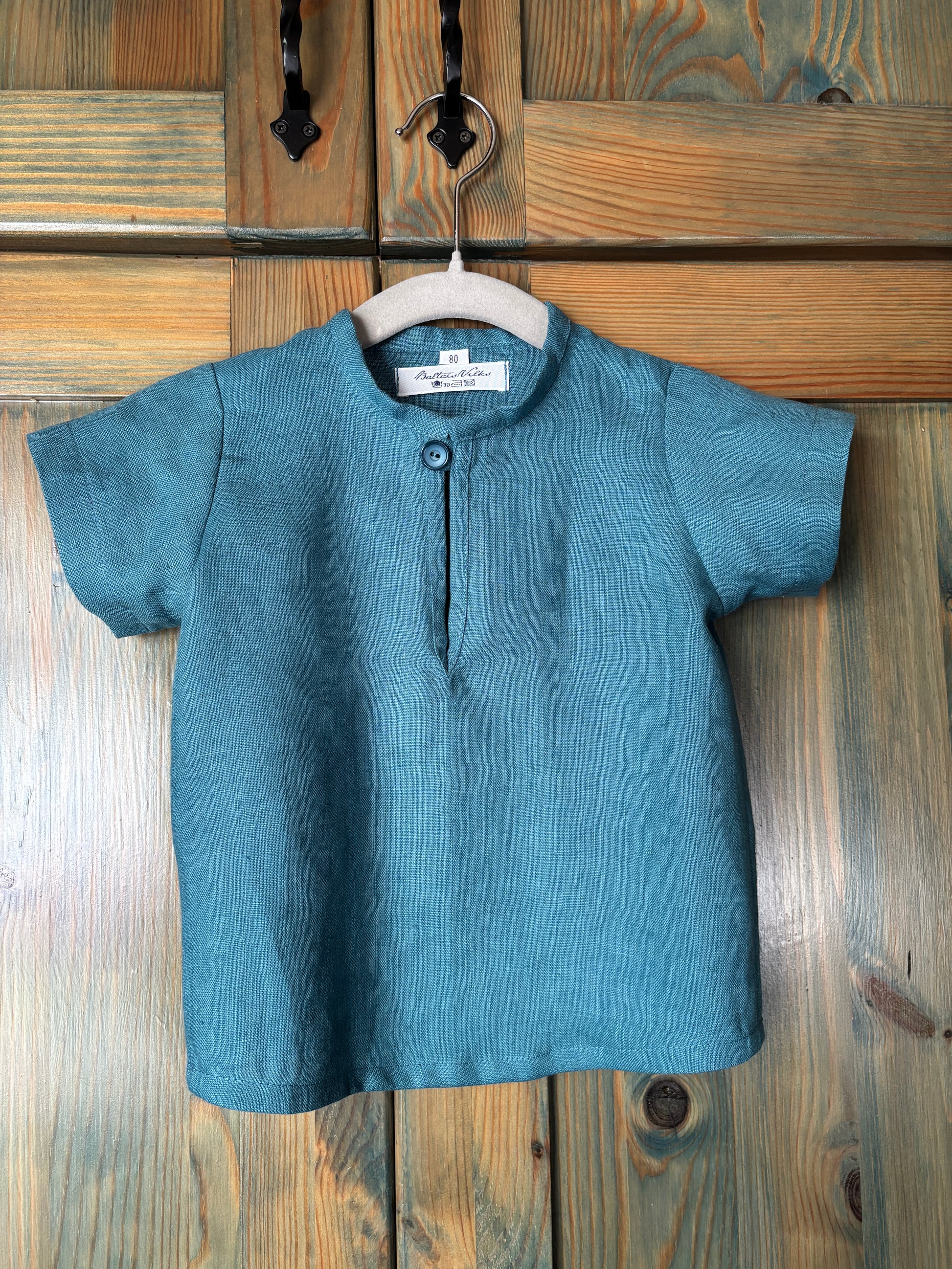 Zēnu lina krekls zaļgani zils ar īsām piedurknēm.
