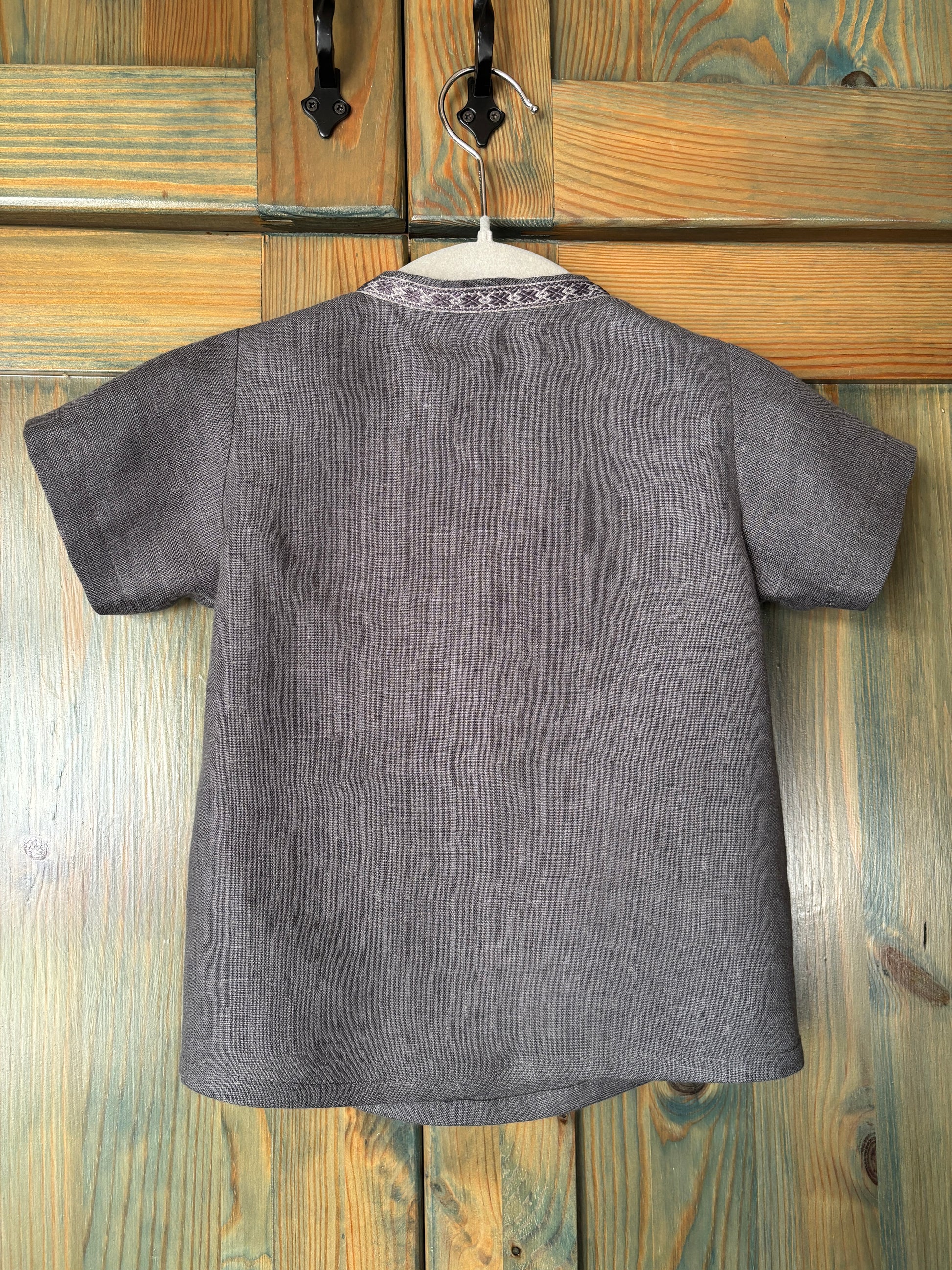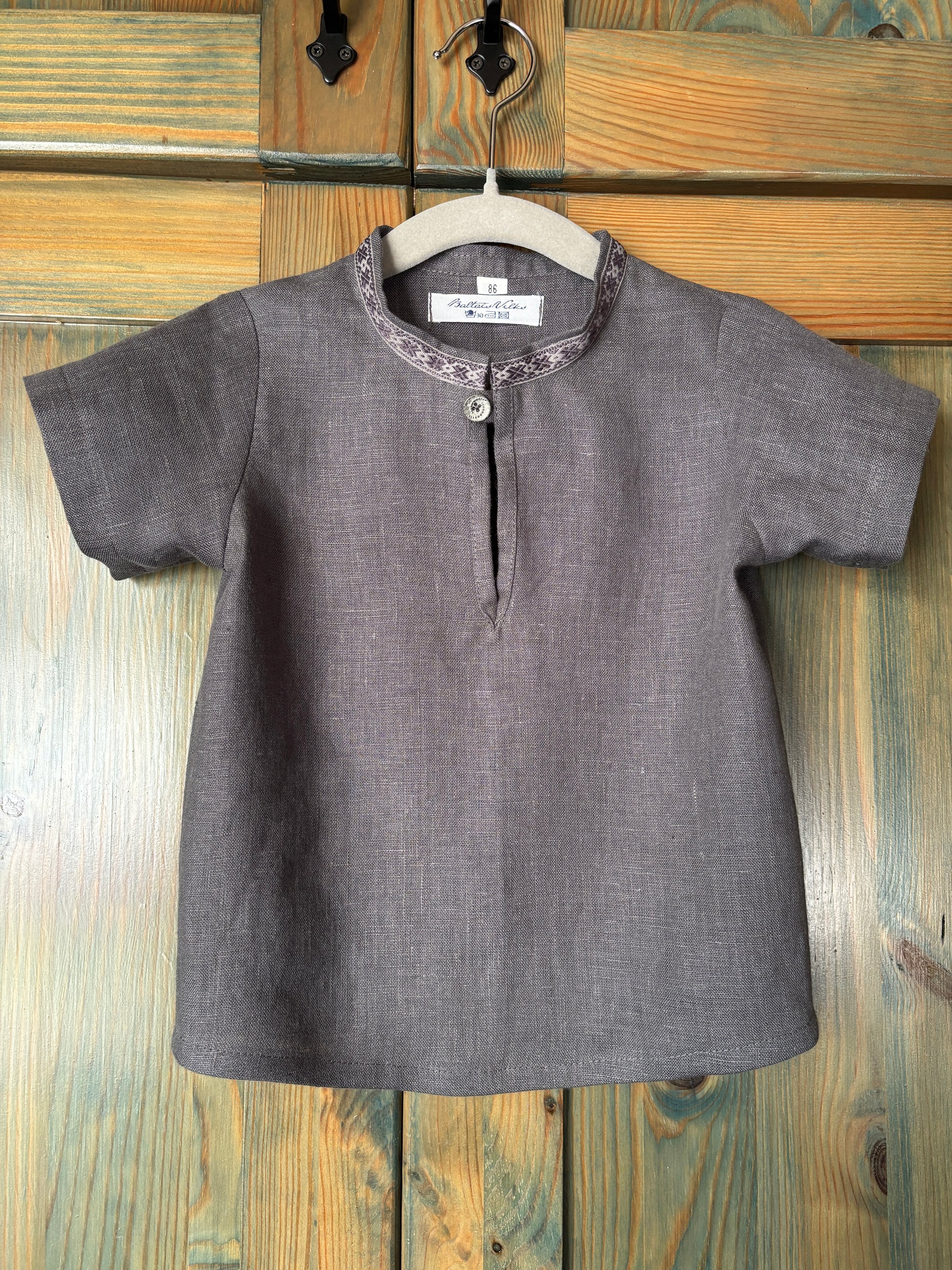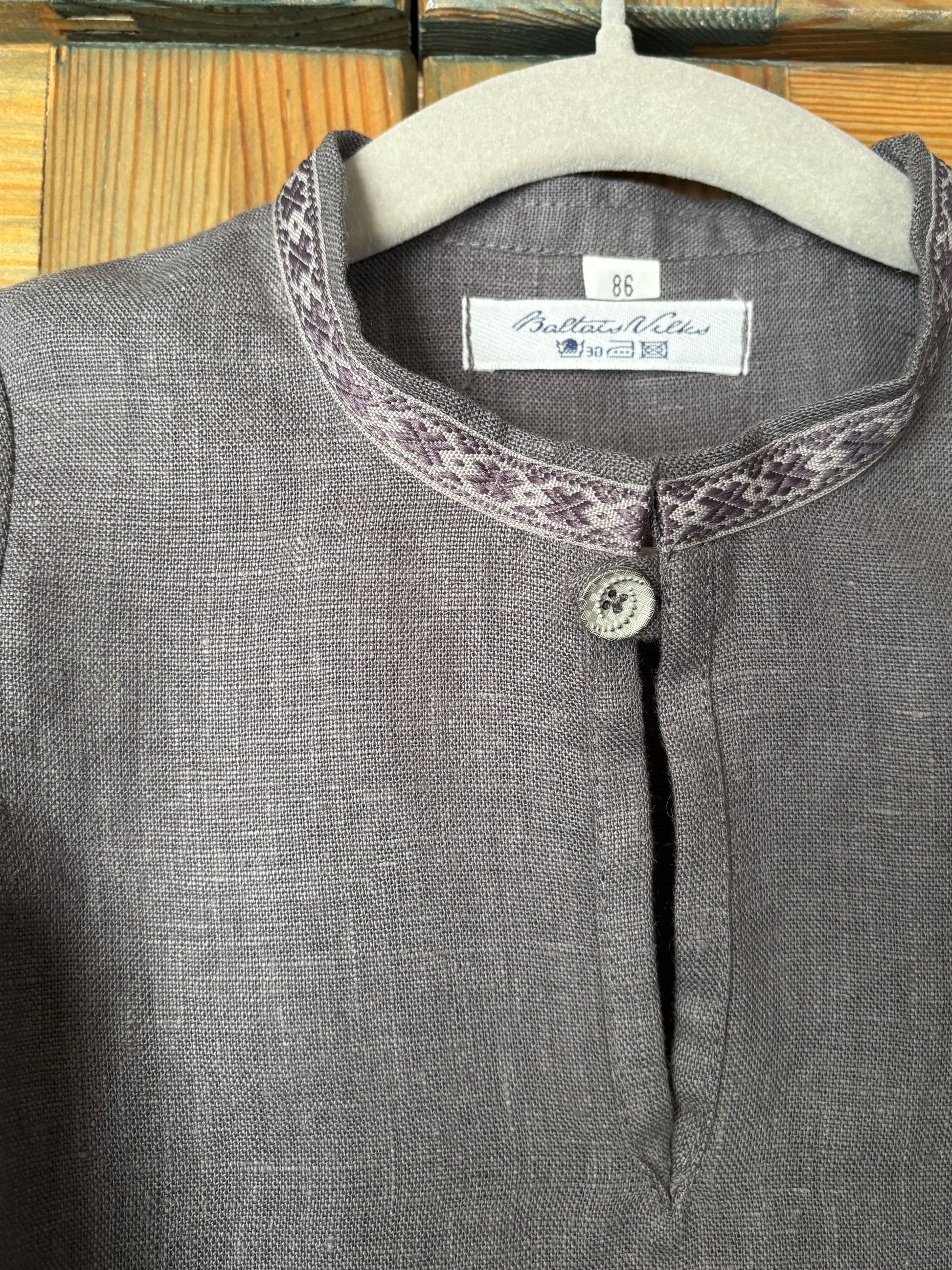 Lina krekls tumši pelēks ar rakstainu lenti stāvkrādziņam.